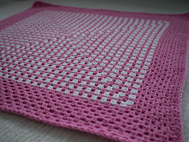 Ei ihan hirveästi varmaan yllätä, että kun kerran innostuin virkkaamaan isoäidinneliöitä ensimmäistä kertaa, niin täytyihin sitä sitten toinenkin tehdä. Mulla on varastossa Samosta jonkin verran ja en saa niistä mitään tehtyä. Keksi tehdä tytöille pienen viltin leikkeihin. Juuri sen kokoisen mihin viisi kerää pinkkiä ja kolme kerää valkoista riittäisi.