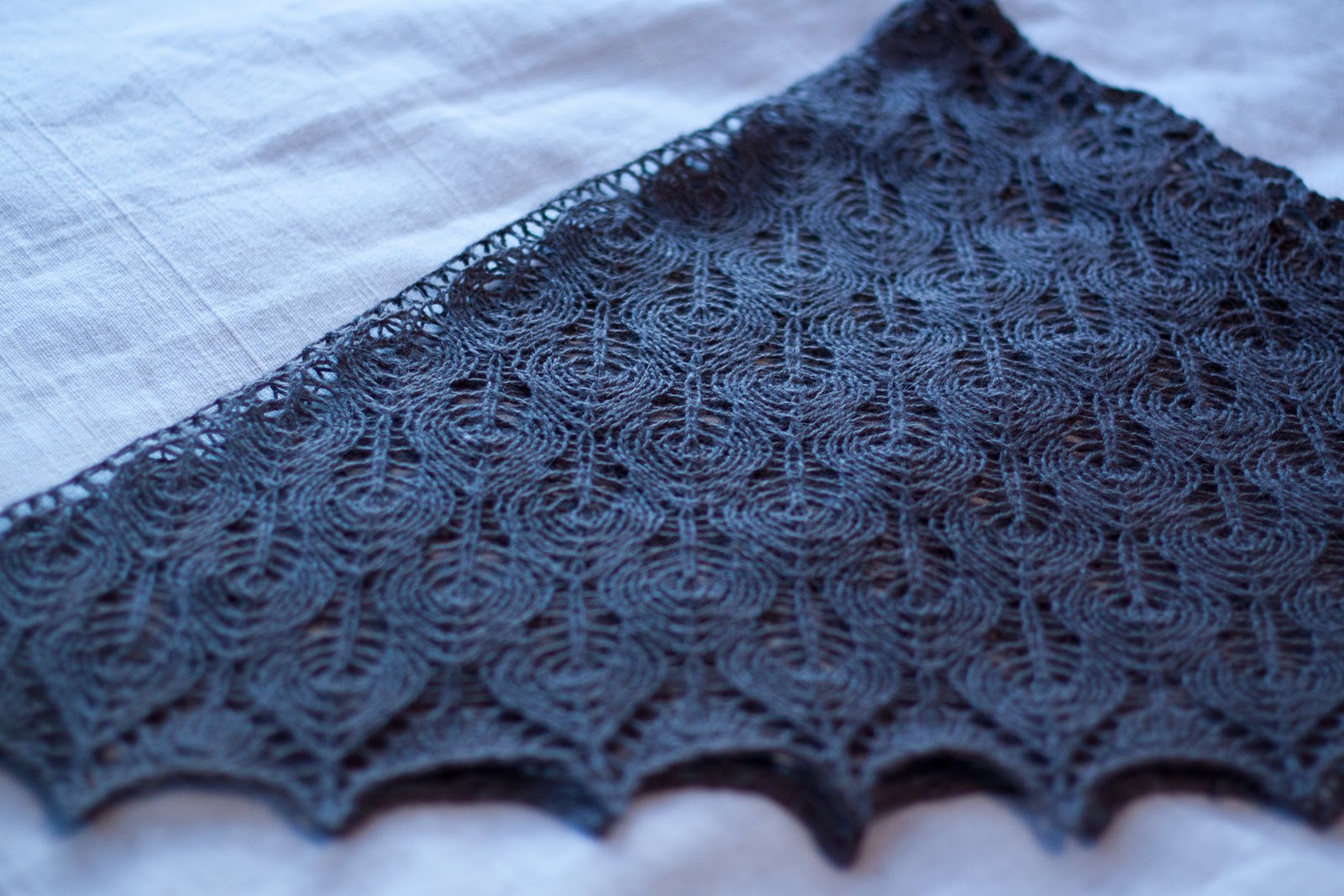 Huiveja on tullut lähetettyä osoitteeseen jos toiseenkin, mutta ensimmäistä kertaa muistan huivilla isosiskoani. Hän pyysi Shetlantilaista vienosti jo kesällä ja nyt hän sellaisen saa joululahjaksi, täysin yllätyksenä toivottavasti. Lankaa oli vain kaksi kerää, mutta ajattelin sen riittävän pienehköön huiviin, sillä tarkoituksena oli kaulalle laitettava huivi, ei olkapäillä lepäävä. Sain tehtyä 10 toistoa kuviota ja reunaa 8 kerroksen verran ja lanka loppui kesken päättelykerroksen. Noin 40 silmukkaa päättelin sitten ruskealla Floricalla. Eron huomaa kyllä, mutta se reuna jää huivin alle piiloon kun huivi on kaulalla, joten ei haitanne.
